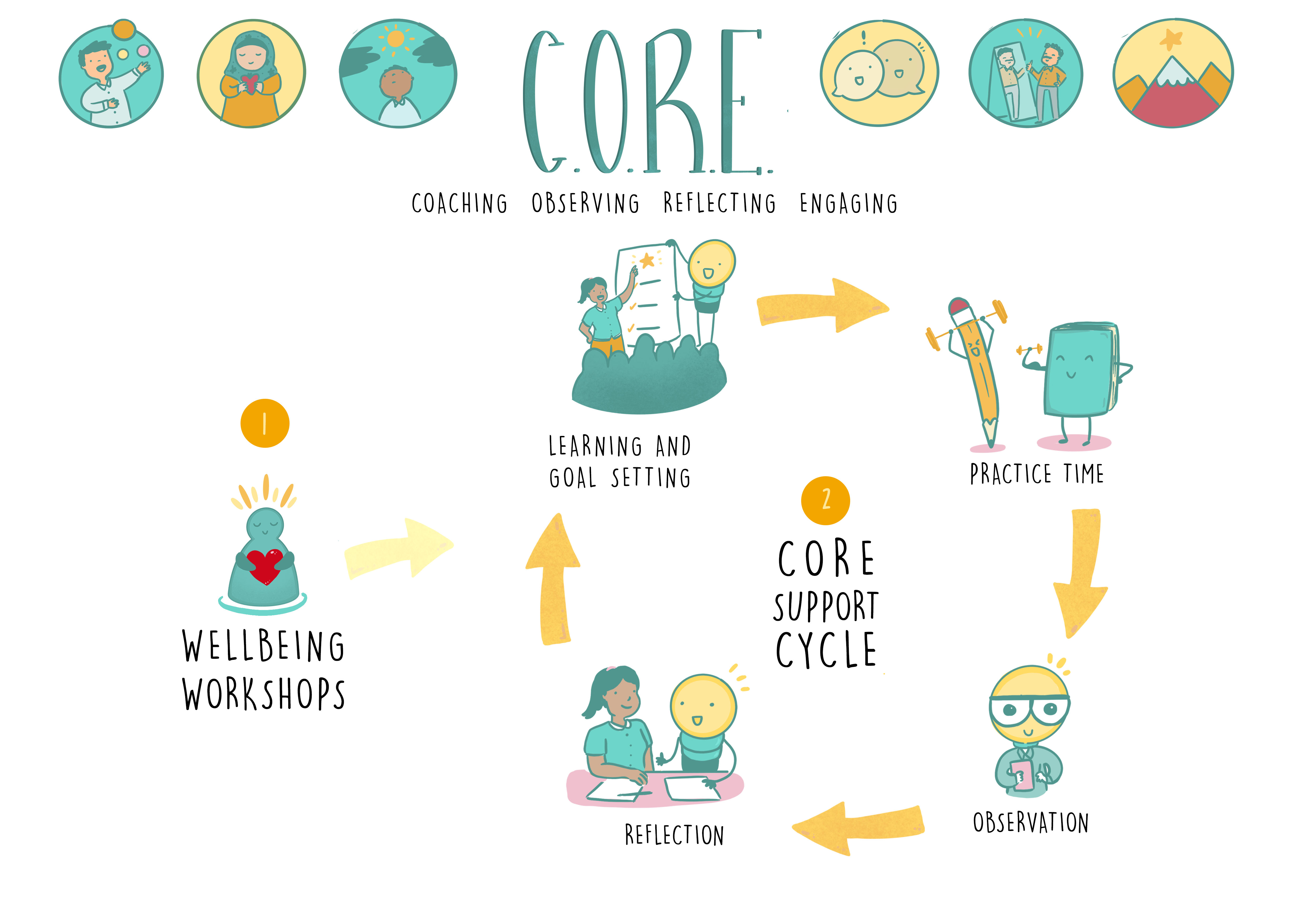 CORE is made up of five two-hour wellbeing workshops and three months of intensive teacher coaching - spread across six modules during regular school hours. To download a schematic overview, click here.